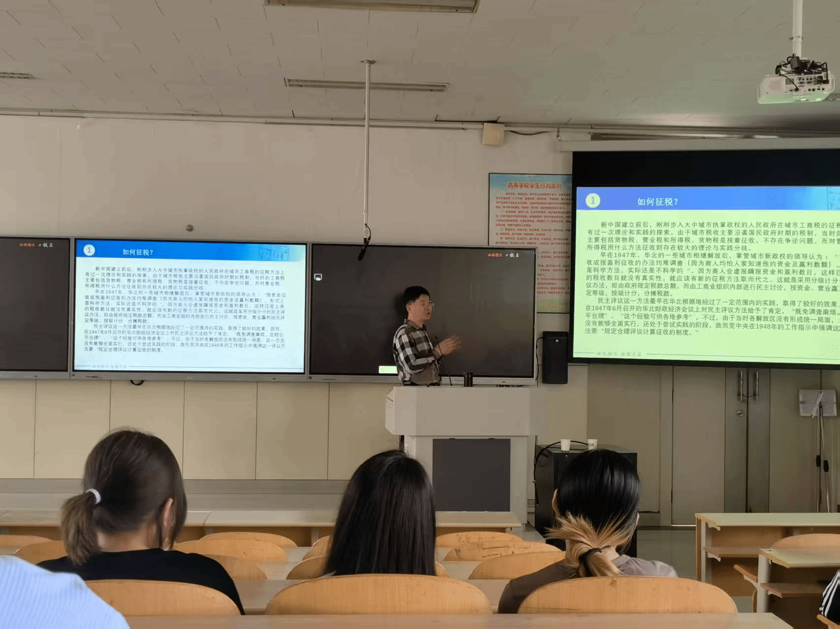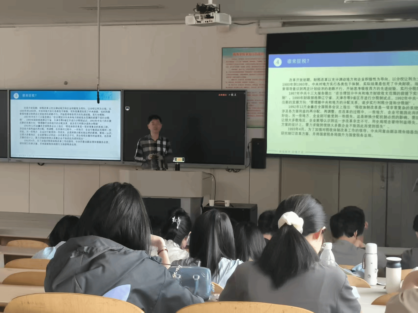 付志宇教授以税收史为载体,围绕“如何征税、对谁征税、征不征税、谁来征税”四大核心问题展开。在“如何征税”部分,付教授聚焦于新中国成立前后城市工商税征税方法的历史变迁,通过梳理上海、天津不同征税模式引发的讨论,以及所引起理论界的观点交锋,揭示了当时税收政策制定的复杂背景与探索历程;在“对谁征税”部分,付教授深入剖析了1953年商品流通税制修正的背景、过程、实施效果及引发的讨论,展现了新中国经济转型时期税收政策调整的复杂性与探索性;在“征不征税”部分,付教授通过深入探讨改革开放后我国“利改税”与“税利分流”改革历程,指出这些改革体现我国税收制度不断适应经济发展、逐步走向成熟的过程;在“谁来征税”部分,付教授系统梳理了中国分税制改革的发展历程,在实施过程中面临物价上涨、部分企业税负加重等问题,但通过及时调整与完善,构建起适应市场经济的财税框架,为国家经济发展和宏观调控提供了有力支撑。此外,付教授运用实例生动诠释了“工具理性与价值理性”“知行互动”等方法论,不仅深化了师生对财税体制的理解,更提供了跨领域的思维工具。