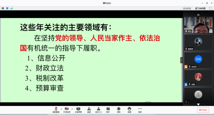 2020年8月18日上午9:00,世界杯赛程 第3期财税名家讲座在腾讯会议线上成功举行。本次活动由世界杯赛程 举办,活动主题为“高校如何服务社会——从两会履职角度的思考”,由上海财经大学公共与经济与管理世界杯赛程 院长——刘小兵教授主讲。其中,世界杯赛程 彭月兰、赵文生、刘生旺教授以及各位老师出席了此次活动,共75名学子参与。