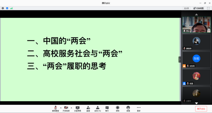 第一部分,怎样理解中国的两会。刘教授指出我国的两会指的是中华人民共和国全国人民代表大会和中国人民政治协商会议的统称,是我国政治生活中最高的两个平台。第二部分,高校服务社会与两会。刘教授首先指出高校服务社会主要是通过高校为学生提供的知识在服务社会过程中所创造的社会价值,高校师生在日常的学术研究和为社会服务的过程中,应当发挥自己学科的特色,要独立思考,用自己的专业精神来做判断。两会可以说是高校服务社会的最高平台,在两会这一平台履职时,社会科学比自然科学更加重要,因为两会商讨的是“国事”,是给一个国家的运行“立规矩”,是确定国家大政方针,是参政议政不是参事议事。第三部分,两会履职的思考。刘教授指出,财政学的专业背景决定了他的关注点不仅仅局限于预算领域,而是紧紧围绕党中央、国务院的决策部署。在履职过程中,他始终坚持党的全面领导、人民当家作主、依法治国有机统一的指导原则。并且重点关注了信息公开、财政立法、税制改革和预算审查等领域。指出信息公开的推进可以解决许多现存的难题。财政立法可以将政府所有的财政行为纳入到立法的范畴,这也是在响应国家法治政府的建设。还指出中国税制的最关键的问题在于直接税与间接税的比例问题,现行的税制对缩小收入差距的作用是逆向的,因此建议降低间接税比重。