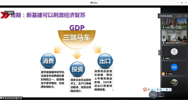 在本次活动中,首先,山西云时代技术有限公司苏经理发表讲话,介绍了云时代技术有限公司的规模、业务、发展前景等,并强调新基建对于当代社会经济发展中的重要作用。接着会议主讲人赵志耘教授从国家层面引出新基建的重要性。一方面,新基建符合我们国家三个面向的要求;另一方面,习近平总书记强调要以经济和科技的融合为切入点,国家对科技创新和产业创新以及人工智能等都高度重视。新基建前所未有地进入到高层的布局之中。接下来,赵志耘博士从新基建的出台背景、新基建的重要领域以及新基建的未来展望三个方面详细讲述新基建带来的新机遇。