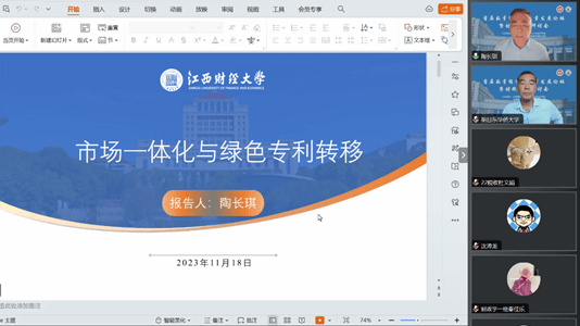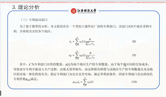 江西财经大学陶长琪教授做了“市场一体化与绿色专利转移”的主旨报告。陶教授的报告主题非常新颖,在基于国内大循环和绿色转型的双重背景下,通过构建理论模型,深入研究了市场一体化促进绿色专利转移的作用机理,并基于社会网格分析方法,运用数据挖掘的方法得到绿色专利的转移量,实证考察市场一体化水平对绿色专利转移的内在机理。陶教授的研究结果显示,市场一体化可以促进绿色技术在区域范围内的有效流动,使各地企业根据自身发展需要公平地获取关键绿色专利技术,对于化解过剩产能、促进绿色产业的健康发展、实现我国经济结构优化转型升级具有重要的现实意义。