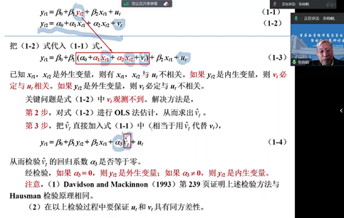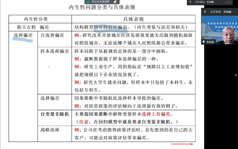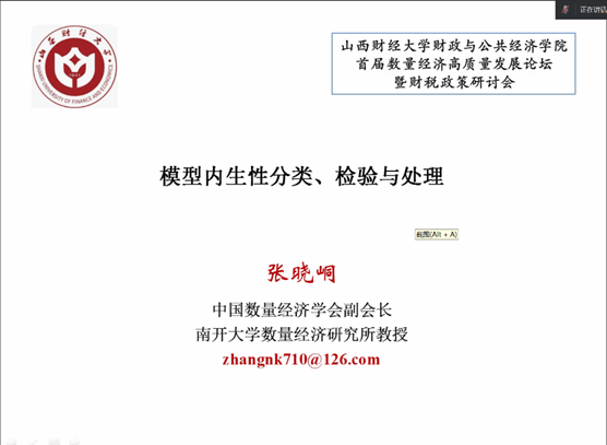 南开大学数量经济研究所原所长张晓峒教授做了题为“模型内生性分类、检验与处理”的主旨报告。张教授的报告对于模型内生性分类的检验以及因果关系的处理给出了非常好的解决方案,分别从内生性问题的分类和具体表现、内生性对模型参数估计的影响、内生性检验,内生性处理常用方法四个部分进行了全面且详细的阐述。张教授特别强调,研究政策评估和因果推断,即便不存在内生性问题,也要有全局观念和系统思维,不能以偏概全,只见局部不见整体,甚至导致错误的结论。