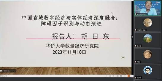 华侨大学数量经济研究中心主任胡日东教授做了“中国省域数字经济与实体经济深度融合:障碍因子识别与动态演进”的主旨报告。胡教授的报告梳理了数字经济、实体经济及数实融合关键概念,建立了科学性、系统性的测度体系,明确了数字经济与基础设施、技术创新及产业创新的耦合机制。其中模型研究部分,通过“熵权-修正耦合”模型度量了中国省域数实融合水平,利用“修正障碍因子模型”剖析了中国省域数实融合障碍因子。最后运用高斯动态核密度估计方法对中国及各区域的数实融合演进趋势进行了可视化分析。