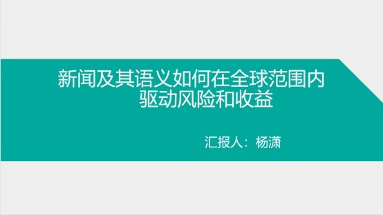 杨潇同学分享了《新闻及其语义如何在全球范围内驱动风险和收益》一文,文章为新闻文章的背景和内容开发了一种分类方法,以预测51个发达经济体和新兴经济体股市的风险和回报。研究结果表明:单词流测度捕获了新闻中与收益、波动和回撤风险相关的重要方面,而且与标准的控制变量的基准回归相比,有明显的增量预测能力。