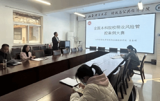 会议室,结合多年来指导学生参加“全国本科院校税收风险管理案例大赛”的实践经验,就赛事组织、案例设计与团队协作等方面向全体教师进行了分享。